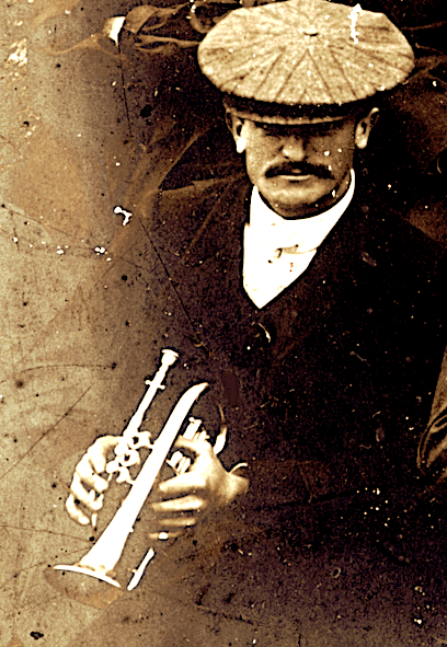 Joueur de conet à piston, détail d’une photo ancienne de noces, région de La Charité (Nièvre) (empruntée au site de Jean-Luc Matte, « Typologie des instruments à vent »)